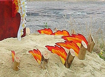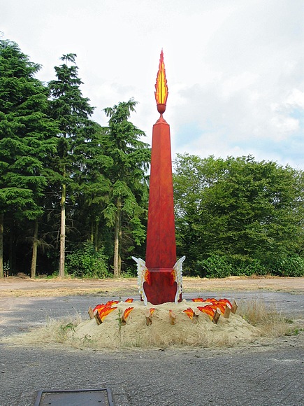 OBELISK An object made at the occasion of a convention with 25 mayors from the province Gelderland. They signed a collective contract concerning agreements about gas-supplying and consuming. The commission was to mark a place on the terrain as a meeting point. On an open spot I have built an obelisk. Anchored in sand and painted in striking, fiery red, it was visible from all directions. Around the obelisk little flame objects are placed in a circle. They refer to a burner of a gas-stove. Four shapes of a wing are mounted on the base so that it seems that the object will rise up. On top is a big blow-pipe flame. It seems as if the obelisk will be launched like a rocket any moment. |