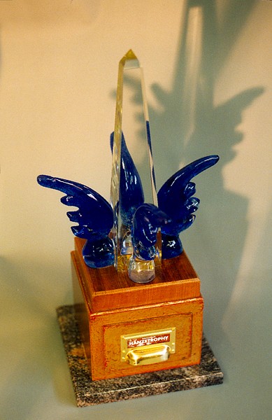 Challenge award for European Hanseatic towns. Awarded for best presentation during the yearly Hanseatic town festival. Every year, the winning town leaves a small souvenir of importance in the drawer in the socle of the object. Therefor, the contents of the award will become more and more valuable over the years. Elk jaar wordt bij het Hanzestadfestival deze wisseltrofee uitgereikt aan de stad die dat jaar het best gepresteerd heeft. Iedere winnaar laat een kostbaar kleinood als souvenir achter in het laatje wat in de sokkel zit. Door de jaren heen wordt de trofee zo steeds waardevoller. De uit optisch glas geslepen obelisk symboliseert de overwinning, het reiken naar het allerhoogste. De vier handgeblazen vleugels 'wijzen' naar de vier windstreken en symboliseren het uitvaren van de handelsschapen over de wereldzeeën. De houten sokkel is bewerkt met bladgoud en staat voor ambachtelijk verworven rijkdom. In de sokkel bevindt zich een lade als metafoor voor de handelsgoederen. |