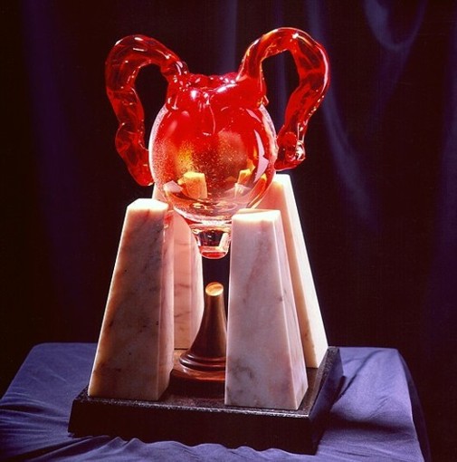 The glass bokal is detached from it's stand and rests on the four marble pillars.