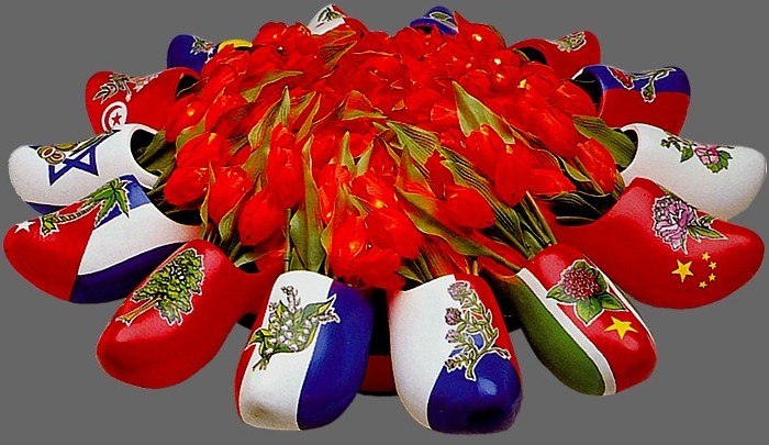 "Mixed Bouquet / Gemengd Boeket" painted wooden shoes, plastic tulips with lightbulbs / beschilderde klompen, plastic tulpen met lampjes 100 x 100 x 40 cm.