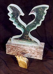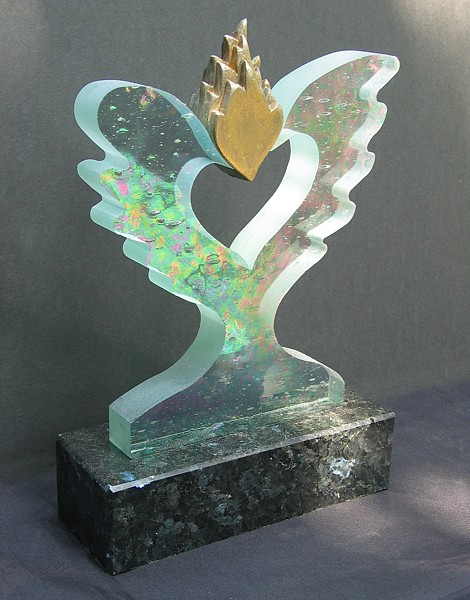 Award designed for wellfare providers. The bronze flame rests between the glass wings.
