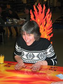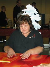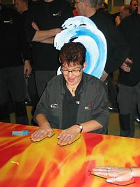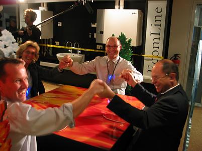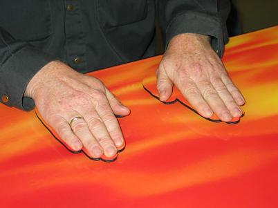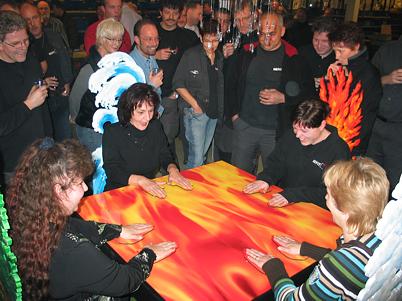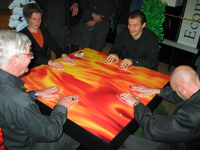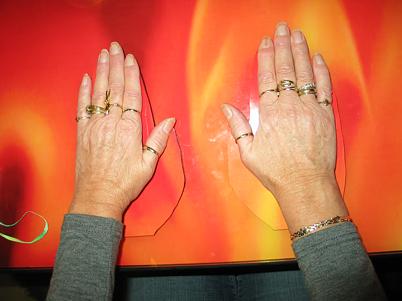 As a team of four persons they lay their hands on a pair of hand shapes.
