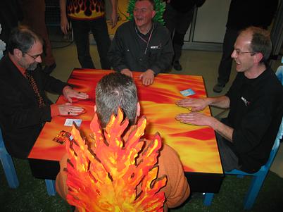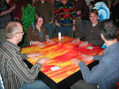 around a square table with a fire print. Under the table are complex sound