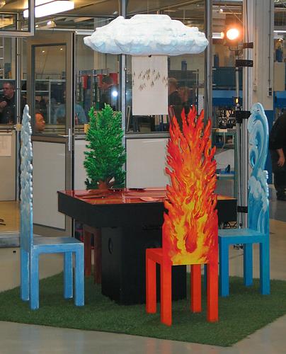 chairs are visualising water, fire, wind and earth. They are standing