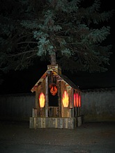of smoke. It seems like inside the wooden house a flaming fire blazes.