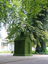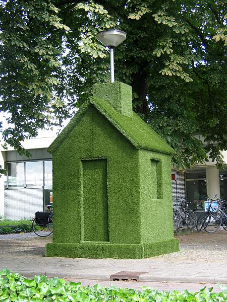 The wooden sculpture is covered with artificial grass. Windows and a door do exist and are visible, but only in shape.